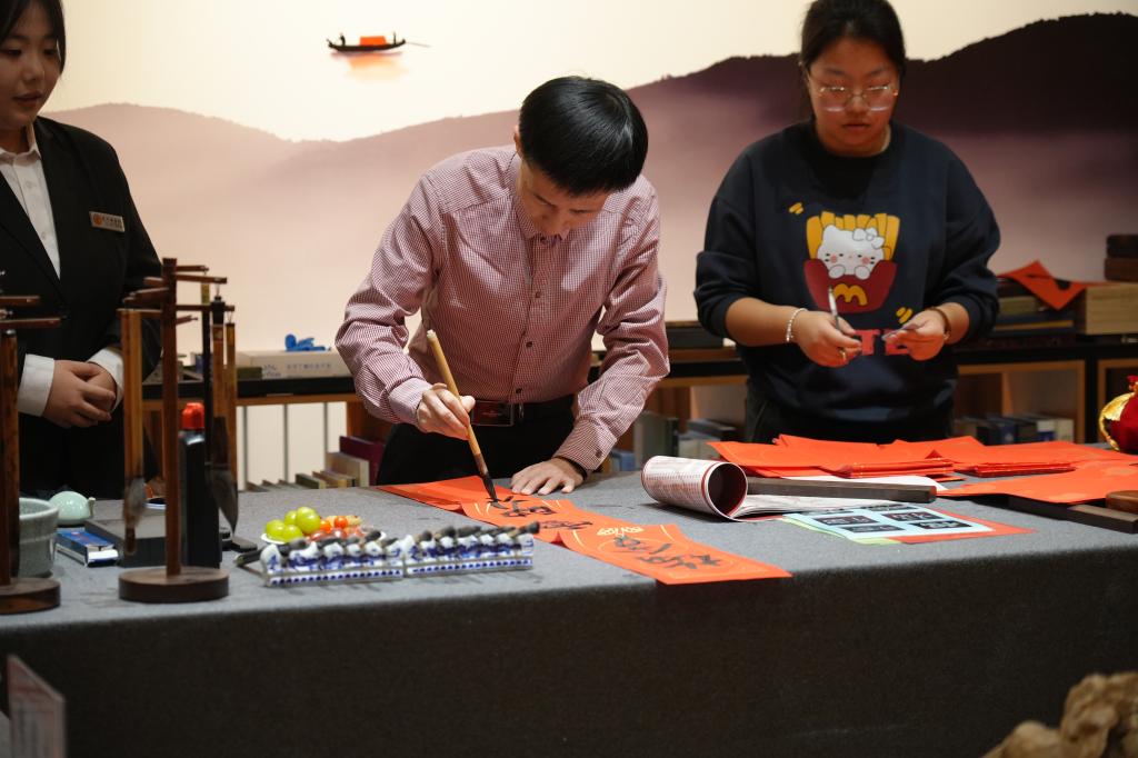 随后,师生们移步三楼 “鉴朗轩”,开启活动第二篇章——“迎新年・送福联”笔会。长春财经学院学生代表孙桐雨与我校学生代表何天田先后发言,分享对书法艺术的热爱与感悟,感谢学校“书法第二课堂” 为两校学子搭建起文化交流、共同提升的优质平台,并向在场师生致以最诚挚的新年祝福。笔会现场,红纸铺展、墨香四溢,老师们挥毫泼墨、笔走龙蛇,一副副寓意吉祥的春联、一个个遒劲饱满的 “福” 字跃然纸上,承载着对新年的美好祝愿。同时,活动还设置了拓印、中国结编织、手工灯笼制作等传统工艺体验环节,师生们踊跃参与、沉浸式体验,在动手实践中感受中华优秀传统文化的独特魅力。