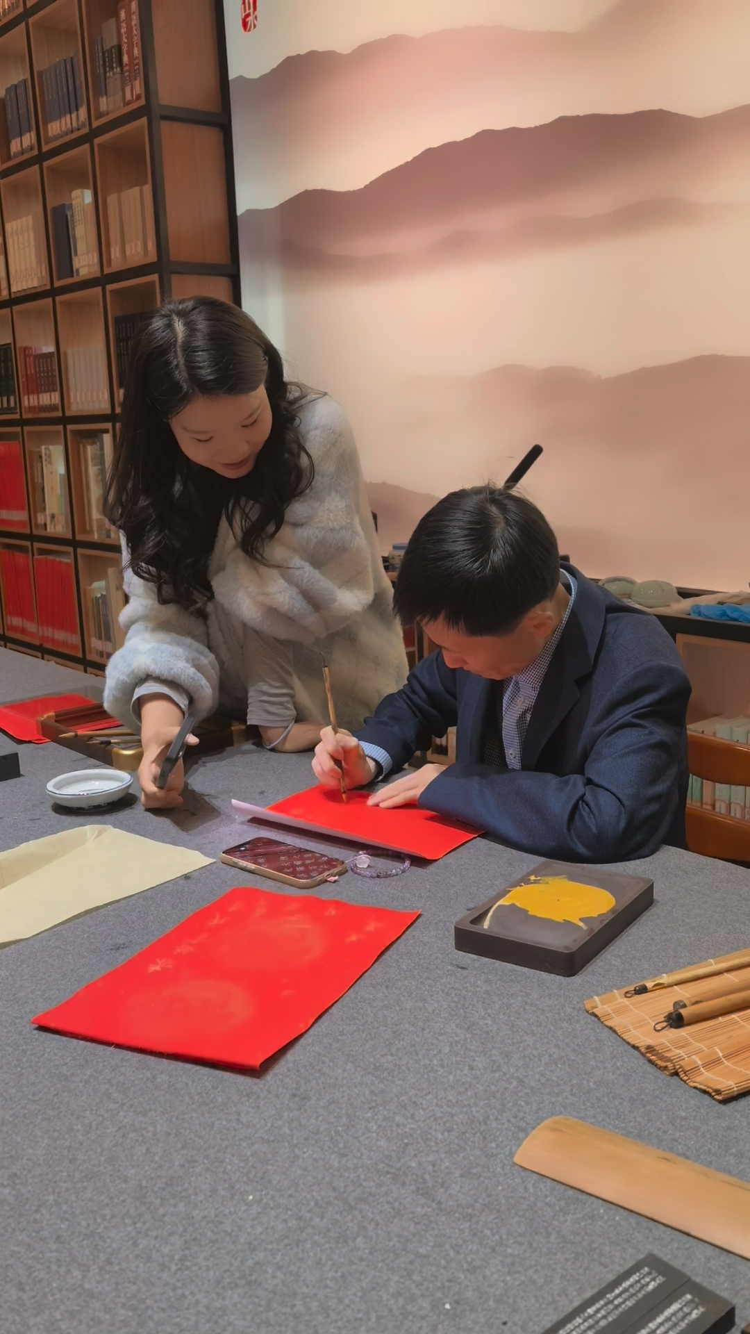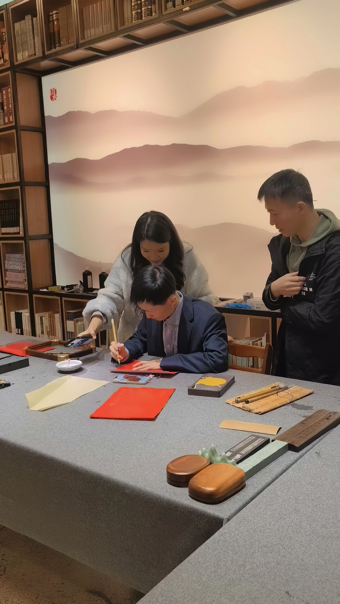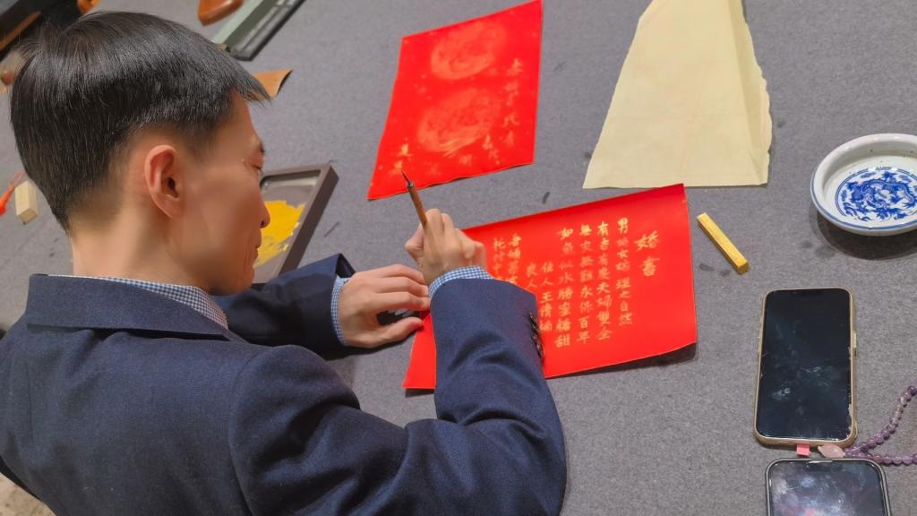 婚期将至,两位新人希望以一份承载母校祝福的婚书,为人生重要时刻留下最特别的纪念。他们深知,董事长康启鹏不仅是学校事业发展的领航者,深耕教育、坚守育人初心,同时深耕书法艺术,长期以墨韵熏陶学子、以文化滋养校园,深受广大师生与校友的敬重与喜爱。得知两位优秀校友喜结良缘,董事长十分欣慰,当场应允为新人题写婚书。现场,董事长凝神运笔,墨落宣纸,笔墨之间皆是期许与祝福,将对新人的美好祝愿融入传统婚书之中,既彰显中华优秀传统文化之美,又寄托母校对学子的深切关怀。书法课老师李二年和读书社指导老师薛京京共同到场见证,题书结束后新人与恩师亲切合影,将这一温暖幸福的瞬间永久定格。