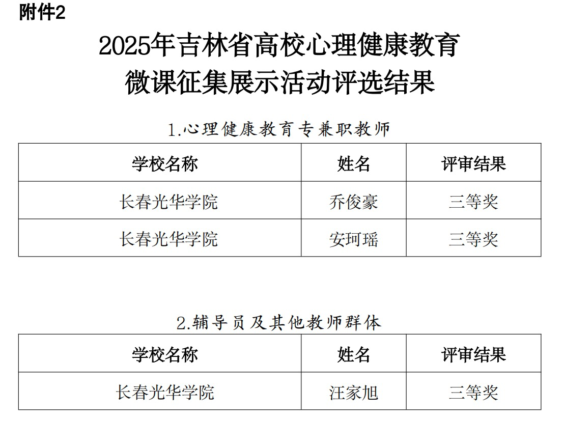 在吉林省教育厅主办的2025年吉林省高校心理健康教育“精彩一课”教学展示活动及微课征集展示活动中,学校三位教师荣获三等奖。(供稿单位 :学生工作处 编辑:刘安妮 责编:曹红梅 初审:杨迦程 复审:杨 鸿 终审:赵 健)