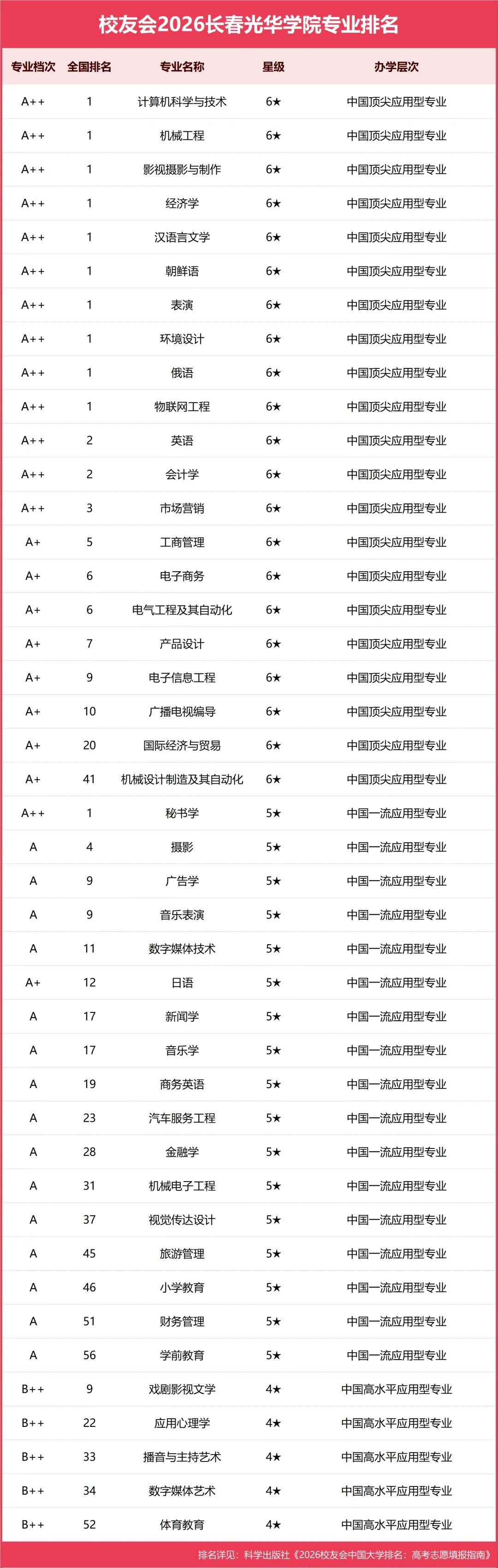 在校友会2026中国大学一流专业排名(应用型)中,长春光华学院位居全国第31名,共有21个专业评为中国六星级专业(6★),17个专业评为中国五星级专业(5★),5个专业评为中国四星级专业(4★),在2026中国大学专业分档排名中,长春光华学院14个专业评为A++,9个专业评为A+,15个专业评为A,5个专业评为B++,位居全国同类高校前列。